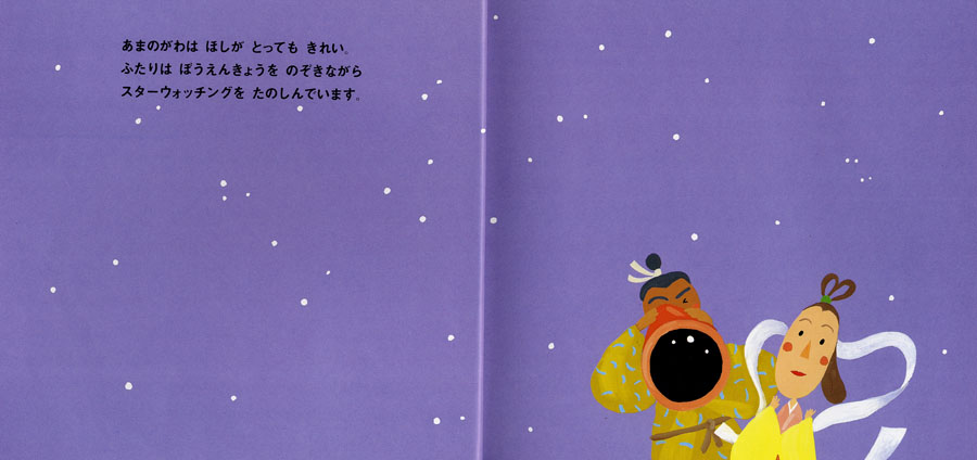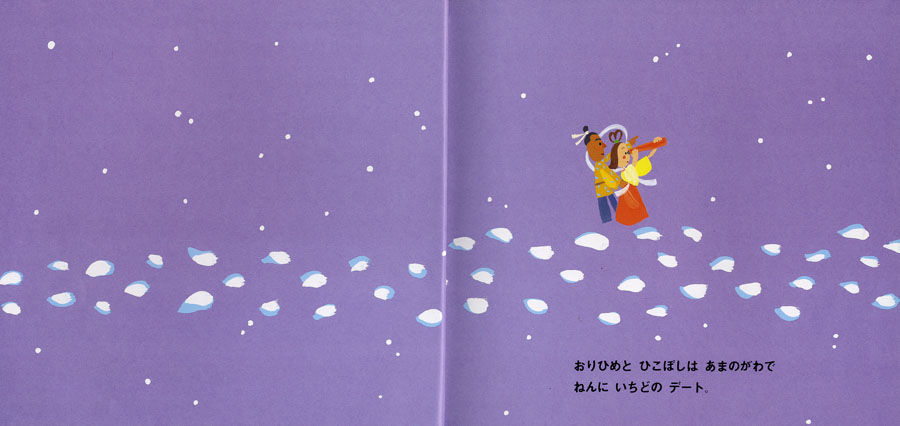 おりひめとひこぼしがたなばたかざりのお願いを見て、叶えてあげようと天の川へ皆をよぶと…。