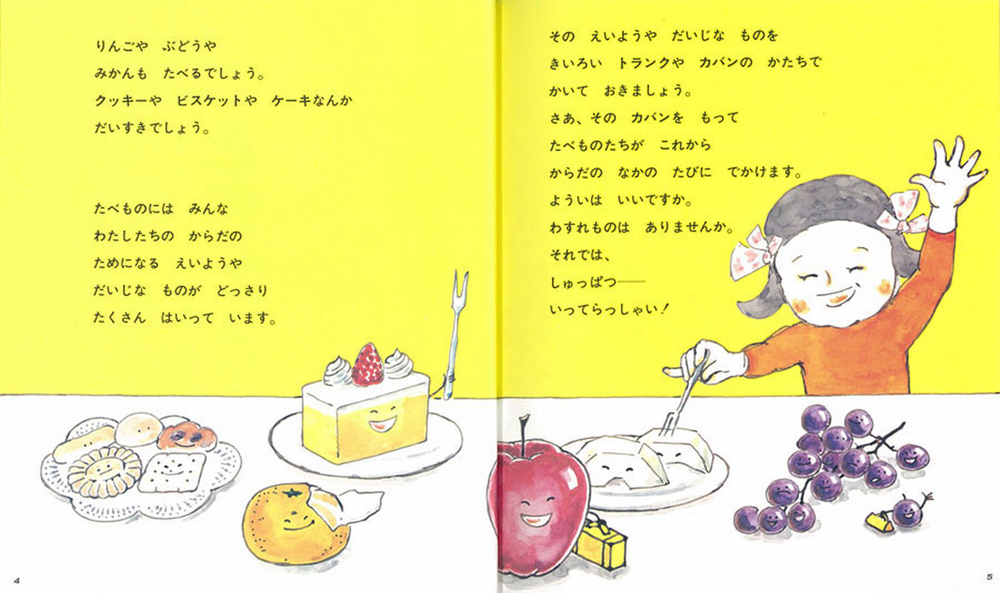 たべものが口から入って身体の中で消化され、栄養となって、排泄されるまでのプロセスを、「たべもののたび」として、わかりやすく楽しく描いたロングセラー絵本。絵本を通じて、正しい知識と、食べることの大切さを子どもたちに伝えます。