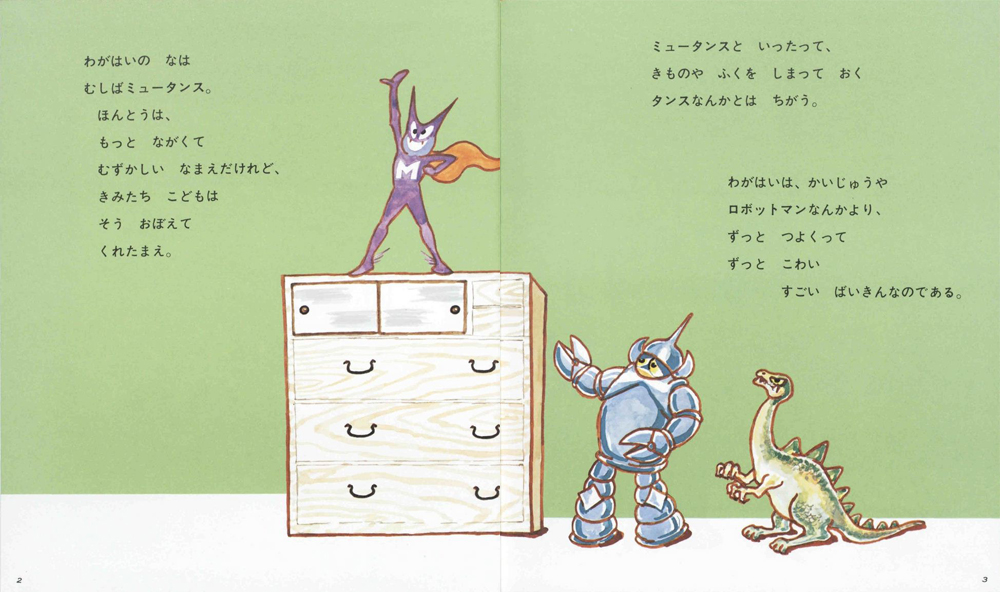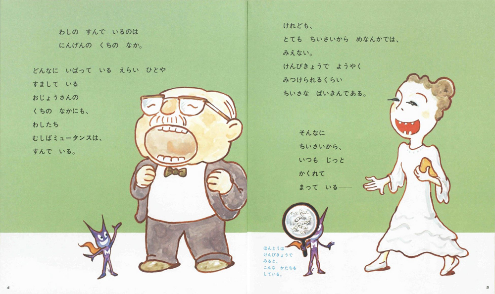 ムシ歯菌ミュータンスが、子どもたちにムシ歯をすすめる形式で、ムシ歯のこわさをおもしろく説く。
